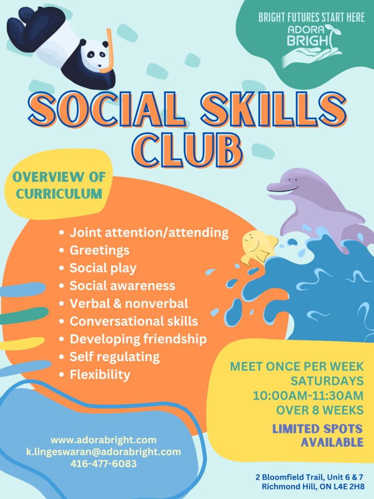 • Social skills group at Adora Bright offer an opportunity for children with autism and other developmental disabilities to practice their social skills with each other and/or typical peers on a regular basis.